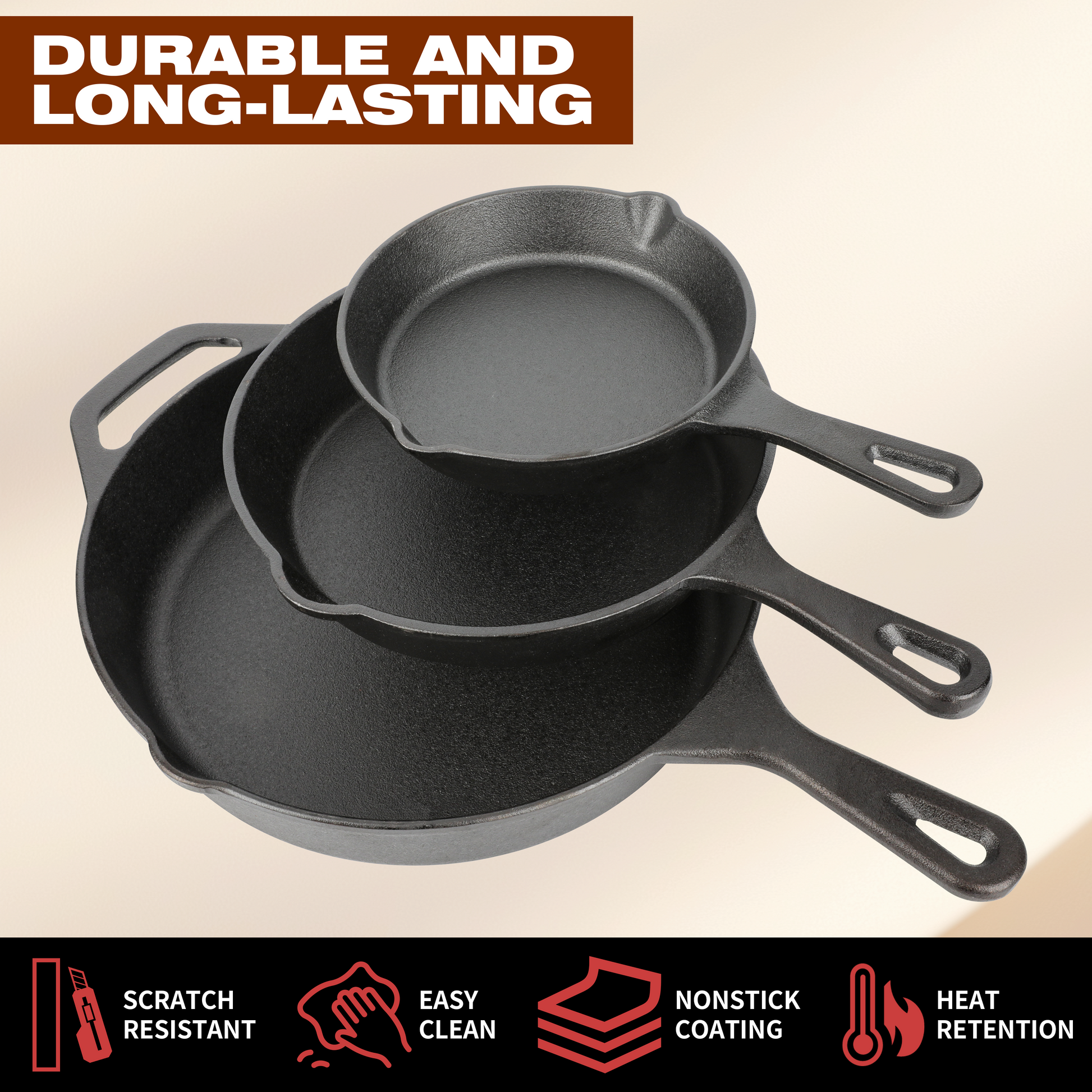 Cast Iron Skillet 3-Piece Set, 6", 8", 10" Frying Pans, Heavy-Duty Pre-Seasoned Pan Cookware Set, For Frying, Saute, Cooking, Pizza & More, Black